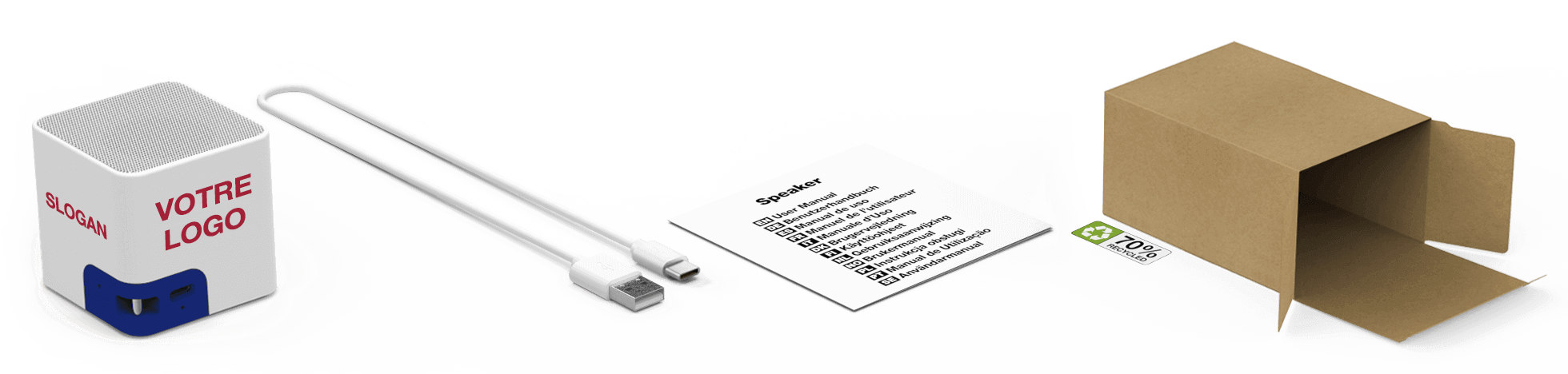 Le nom Bluetooth® est ce que l'utilisateur voit sur son smartphone ou sa tablette lorsqu'il veut connecter le produit audio. Nous pouvons personnaliser ce nom, et ainsi donner une plus grande visibilité au nom de votre société, en renommant le produit avec votre nom ou marque. Si vous ne souhaitez pas bénéficier de ce service, nous afficherons le nom par défaut 'Promo Audio'.Accessoires