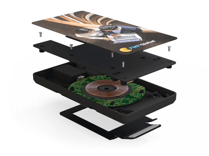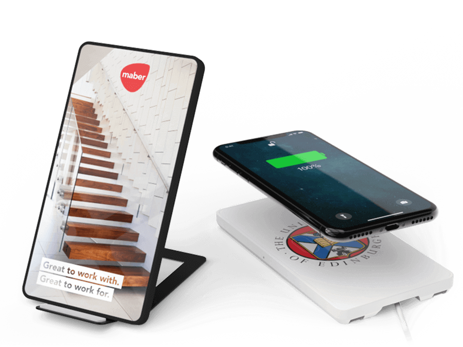 Le chargeur sans fil Stand possède une grande surface de marquage qui permet l'impression digitale avec votre image, slogan, site internet et plus. Ce parfait compagnon de table est composé de la dernière technologie de recharge sans fil qui permet vos clients de recharger n'importe quels de leurs appareils équipés de la technologie Qi, incluant les derniers iPhone et smartphones Android.