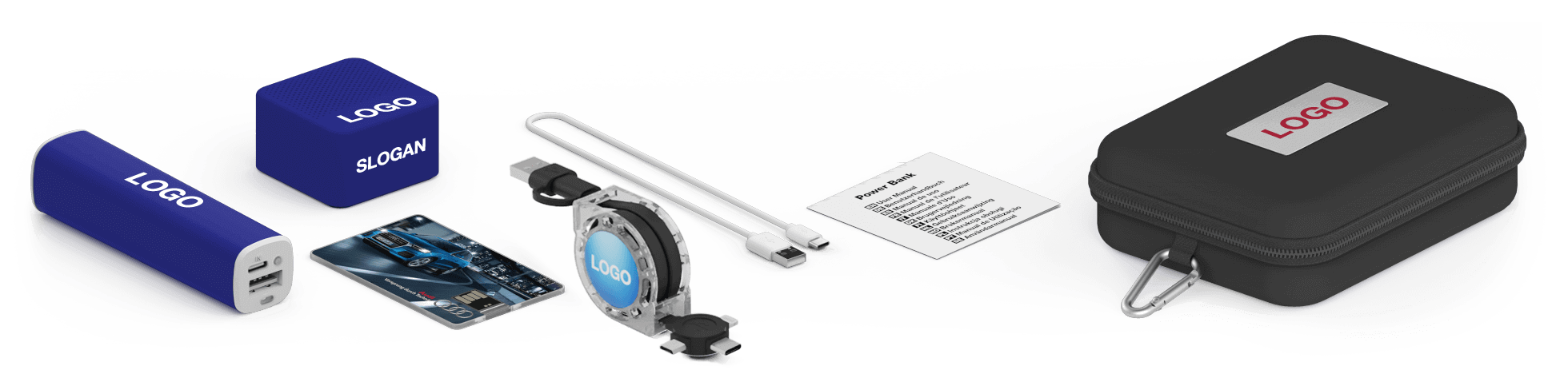 Combinez 4 produits dans un coffret cadeaux de voyage pratique: Wafer Carte USB, Core Power Bank, Motion Câble USB, Ray Enceinte Bluetooth®. Les produits soigneusement rangés à l'intérieur peuvent être marqués de votre logo, de votre site internet, de votre slogan et plus. Le dessus du coffret Cadeau peut aussi être gravé au laser ou Sérigraphié jusqu'à 4 couleurs. Vous pouvez combiner les couleurs des different produits à souhait.