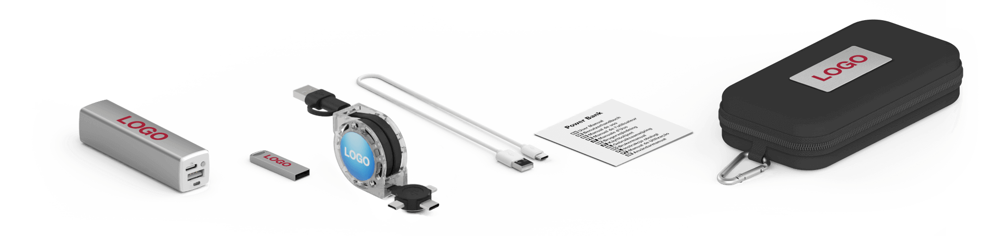 Combinez 3 produits dans un coffret cadeaux de voyage pratique: Focus Clé USB, Element Power Bank, Motion Câble USB. Les produits soigneusement rangés à l'intérieur peuvent être marqués de votre logo, de votre site internet, de votre slogan et plus. Le dessus du coffret Cadeau peut aussi être gravé au laser ou Sérigraphié jusqu'à 4 couleurs. Vous pouvez combiner les couleurs des different produits à souhait.