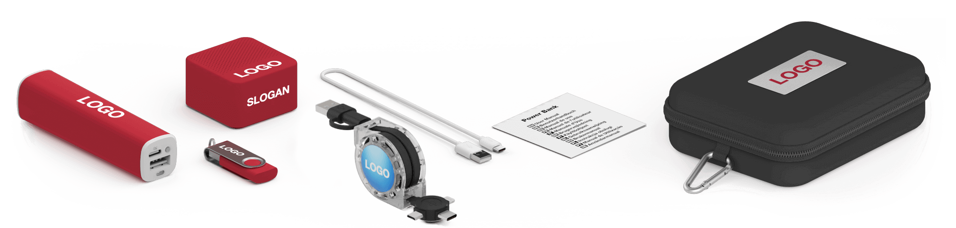 Combinez 4 produits dans un coffret cadeaux de voyage pratique: Twister Clé USB, Core Power Bank, Motion Câble USB, Ray Enceinte Bluetooth®. Les produits soigneusement rangés à l'intérieur peuvent être marqués de votre logo, de votre site internet, de votre slogan et plus. Le dessus du coffret Cadeau peut aussi être gravé au laser ou Sérigraphié jusqu'à 4 couleurs. Vous pouvez combiner les couleurs des different produits à souhait.