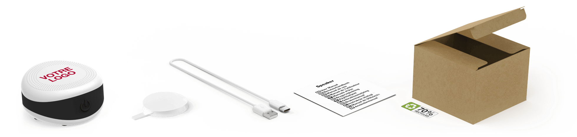 Le nom Bluetooth® est ce que l'utilisateur voit sur son smartphone ou sa tablette lorsqu'il veut connecter le produit audio. Nous pouvons personnaliser ce nom, et ainsi donner une plus grande visibilité au nom de votre société, en renommant le produit avec votre nom ou marque. Si vous ne souhaitez pas bénéficier de ce service, nous afficherons le nom par défaut 'Promo Audio'.