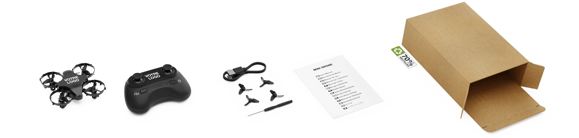 Le mini drone Bee est un produit promotionnel exceptionnel qui ne manquera pas d'être apprécié par votre personnel, vos clients et les heureux destinataires de vos cadeaux. Les commandes intuitives et la fonction de vol facile sont parfaites pour les amateurs de drone comme pour les novices. Il y a 3 zones de marquage dédiées sur le drone lui-même, et une autre zone de marquage sur le contrôleur. Contactez-nous dès aujourd'hui pour plus d'informations sur le marquage, les prix et les délais de livraison.