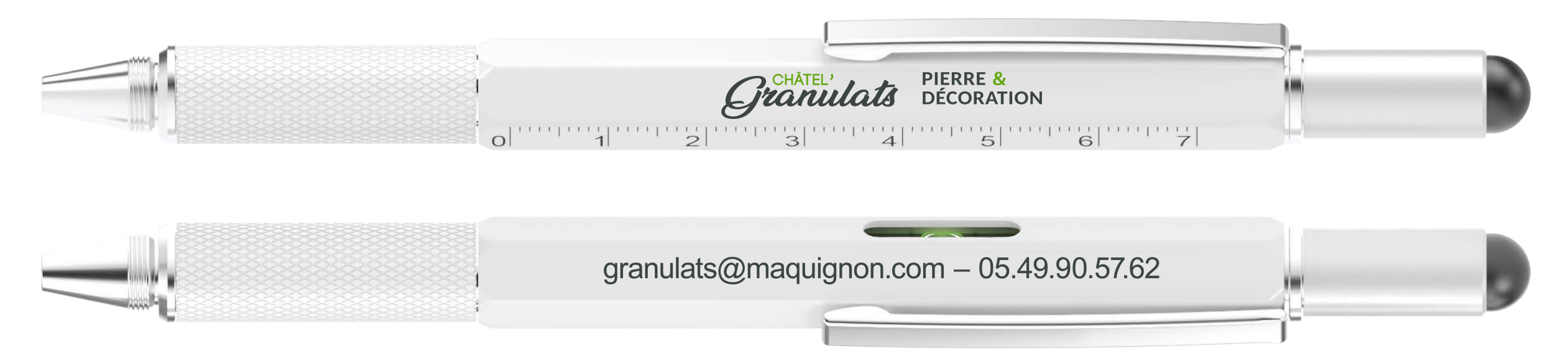 Le Stylo Multi-fonctions Star réunit 5 outils pratiques en 1 seul produit design. Il inclut 1 Stylet, un Tournevis, une Règle, un Niveau à bulle et un Stylo à bille. Le Star contient 2 larges surfaces qui peuvent être marquées de votre logo, slogan, site web et bien plus. Élégant et léger, le Star est extrêmement populaire pour les événements et les conférences.