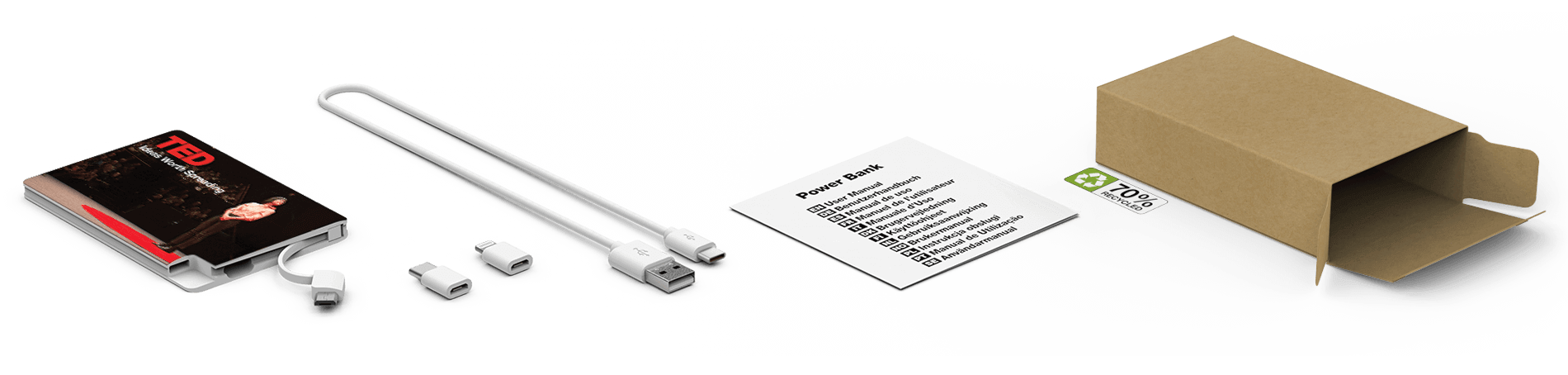 Notre modèle Card est compact, chic et coloré. Sa grande surface est un grand espace pour promouvoir votre marque dans des couleurs vibrantes. Les deux côtés peuvent être imprimés en photo avec le slogan et l'image de votre marque. La carte est dotée d'un câble Micro-USB attaché, d'un adaptateur Lightning et d'un adaptateur USB-C, garantissant que tous les principaux types de périphériques soient couverts, y compris les appareils iPhone™, iPad™ et Android. À seulement 7 mm d'épaisseur, c'est un moyen pratique pour vos clients de ne jamais manquer de batterie.