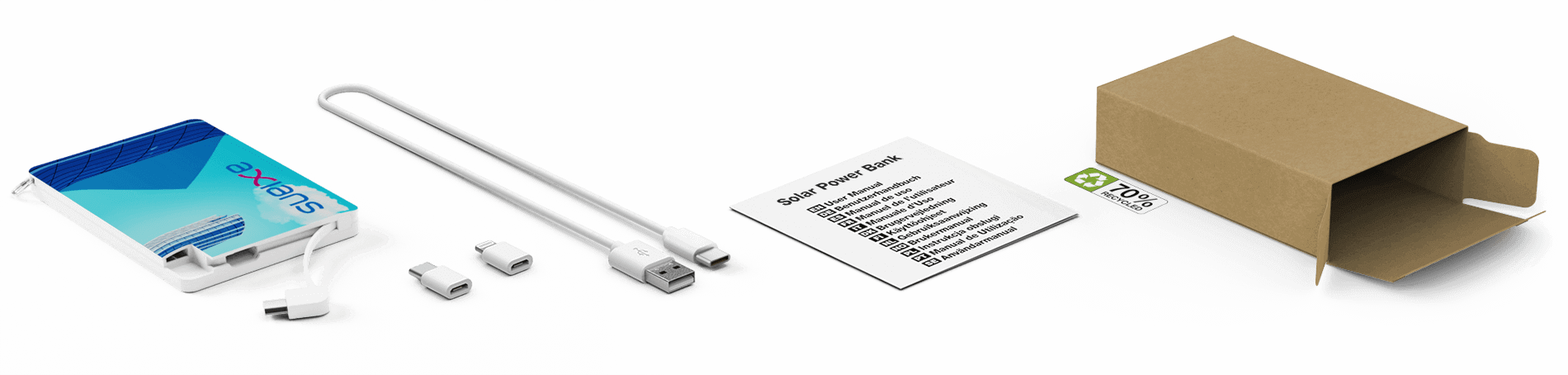 La batterie Solar est une Power Bank fantastique au design innovant. Elle présente une large zone de marquage sur un côté et un panneau solaire sur l'autre, conçu pour convertir l'énergie du soleil en énergie qui recharge le Power Bank. Vous pouvez également le recharger par des moyens conventionnels via l'entrée USB-C. Une excellente idée de produit promotionnel qui sera conservé pendant des années.