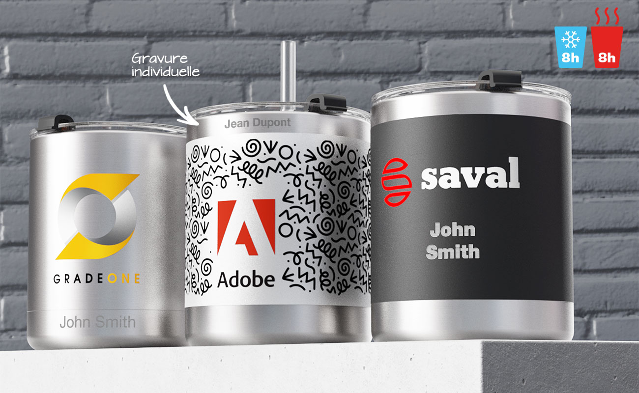 La gravure permet de marquer de manière totalement indélébile vos noms/prénoms. Ce service est idéal pour les clubs sportifs et les écoles, car il permet d'éviter toute confusion potentielle entre les bouteilles d'eau ou les tasses pendant les entraînements ou les compétitions. Chaque nom accompagnera votre logo et votre slogan sur le produit.