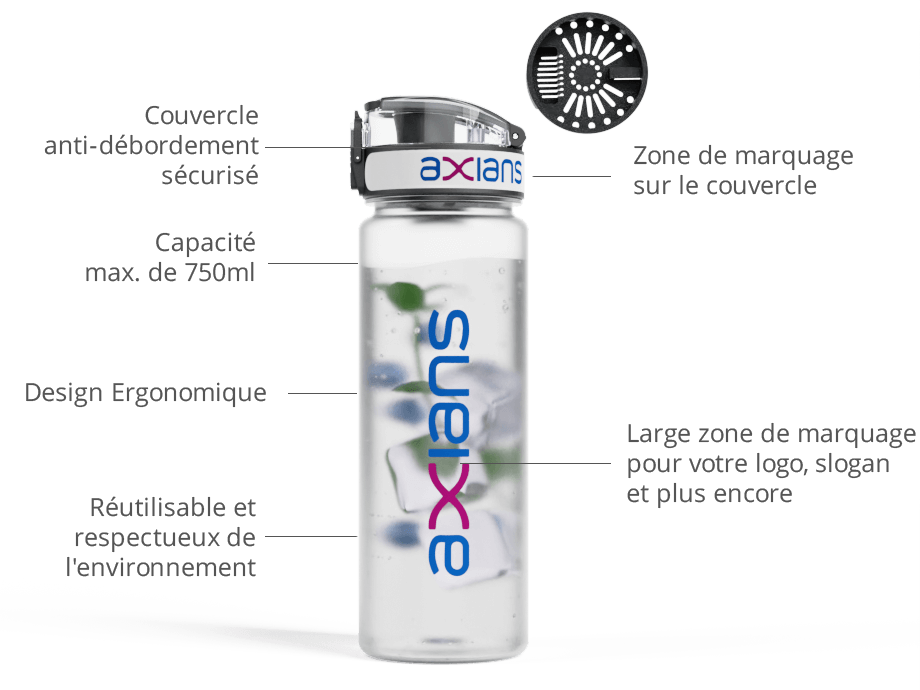 L'Aqualok Infuse constitue un excellent complément aux campagnes marketing externes ou internes où la promotion d'un mode de vie sain et de votre marque qui est l'essentielle. Elle peut être entièrement personnalisée et adaptée à l'esthétique de votre marque, de la couleur de la bouteille à l'illustration imprimée dessus.