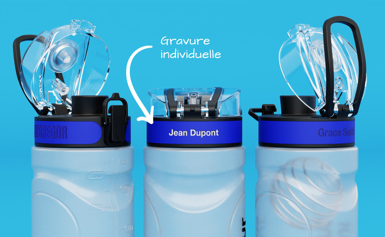 La gravure permet de marquer de manière totalement indélébile vos noms/prénoms. Ce service est idéal pour les clubs sportifs et les écoles, car il permet d'éviter toute confusion potentielle entre les bouteilles d'eau ou les tasses pendant les entraînements ou les compétitions. Chaque nom accompagnera votre logo et votre slogan sur le produit.