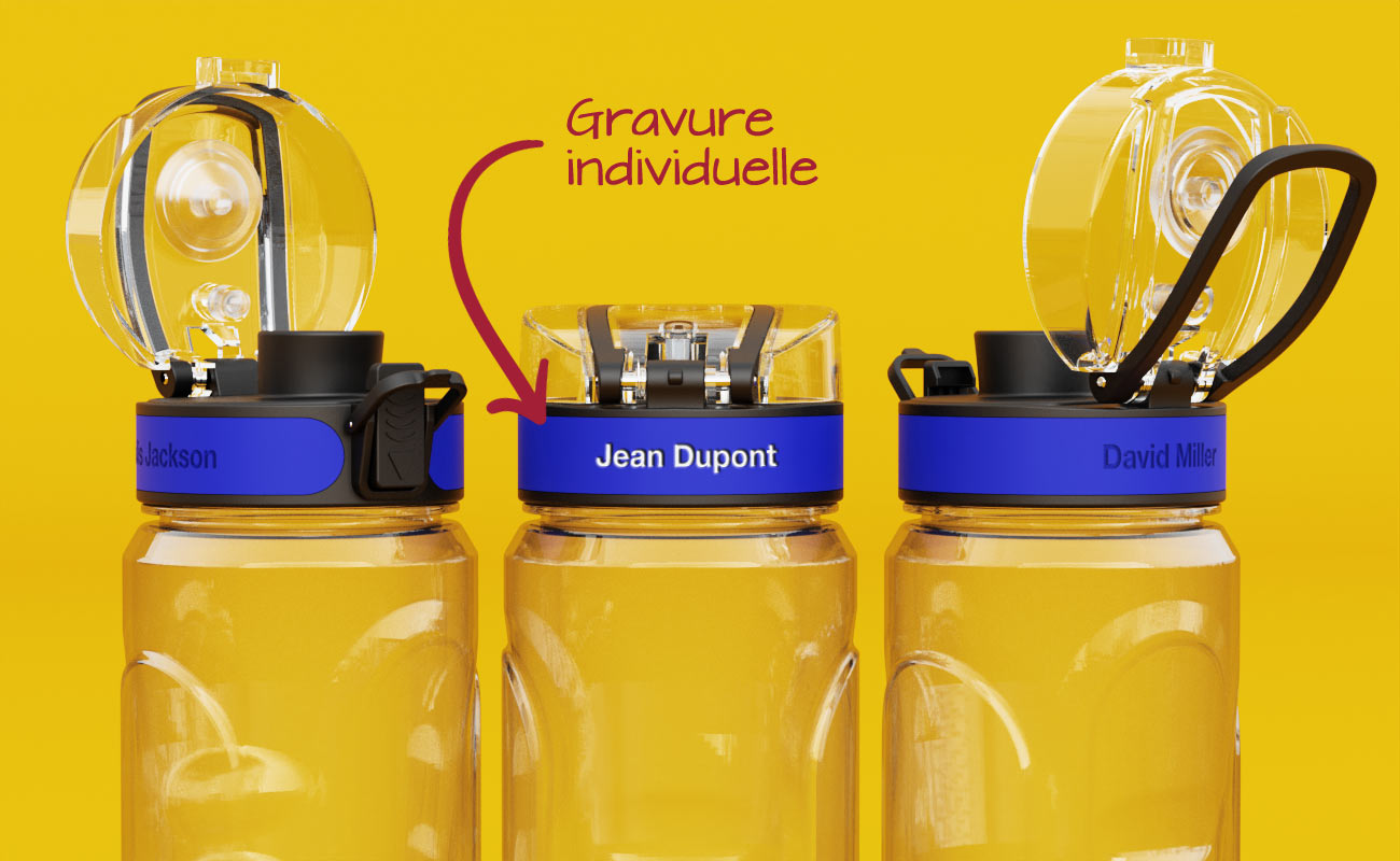 La gravure permet de marquer de manière totalement indélébile vos noms/prénoms. Ce service est idéal pour les clubs sportifs et les écoles, car il permet d'éviter toute confusion potentielle entre les bouteilles d'eau ou les tasses pendant les entraînements ou les compétitions. Chaque nom accompagnera votre logo et votre slogan sur le produit.
