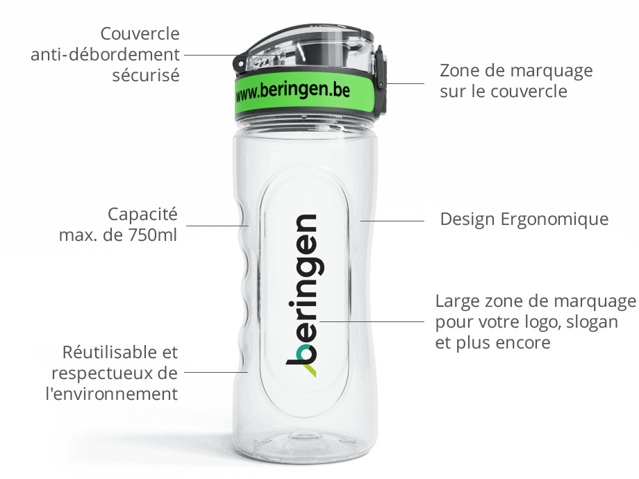 La gravure permet de marquer de manière totalement indélébile vos noms/prénoms. Ce service est idéal pour les clubs sportifs et les écoles, car il permet d'éviter toute confusion potentielle entre les bouteilles d'eau ou les tasses pendant les entraînements ou les compétitions. Chaque nom accompagnera votre logo et votre slogan sur le produit.